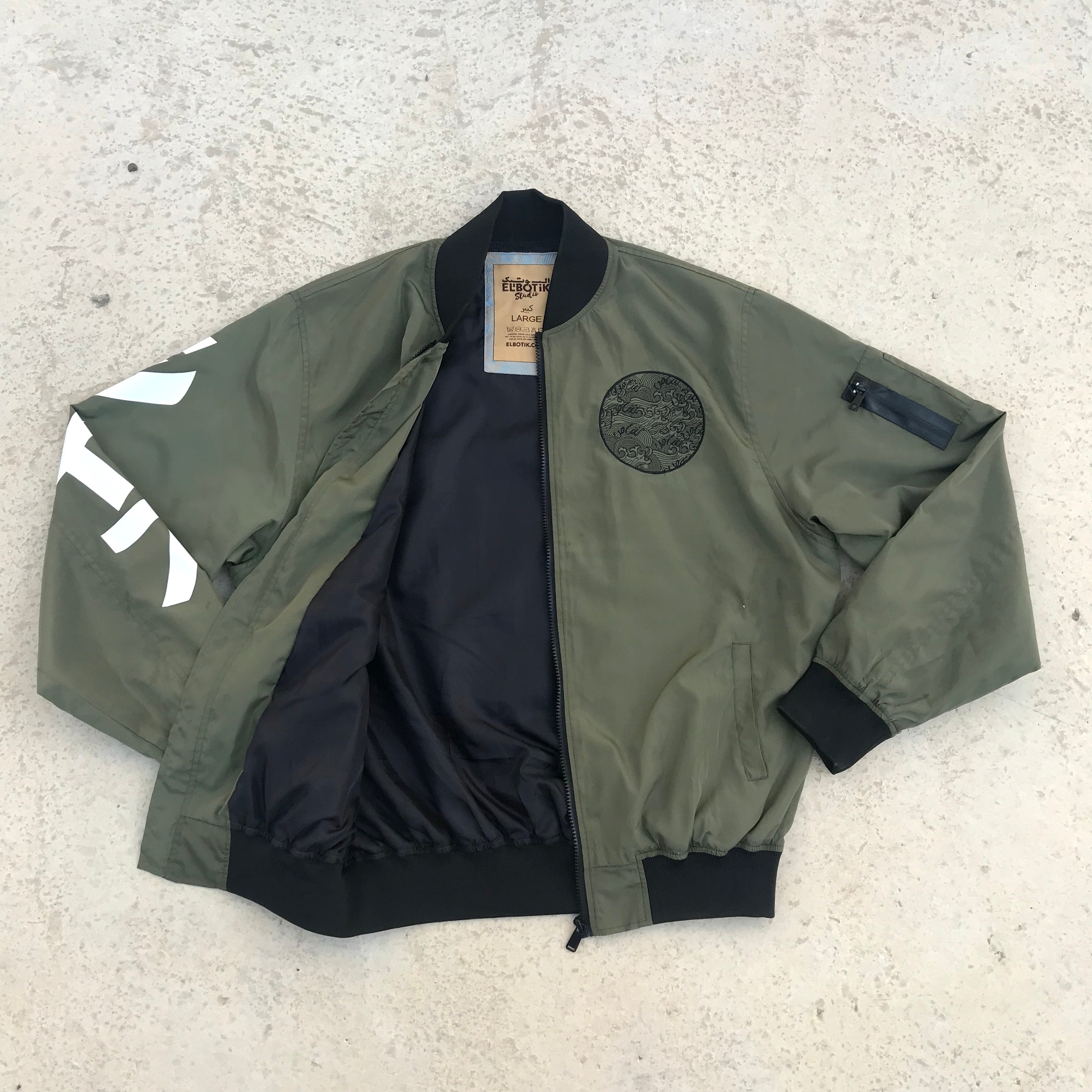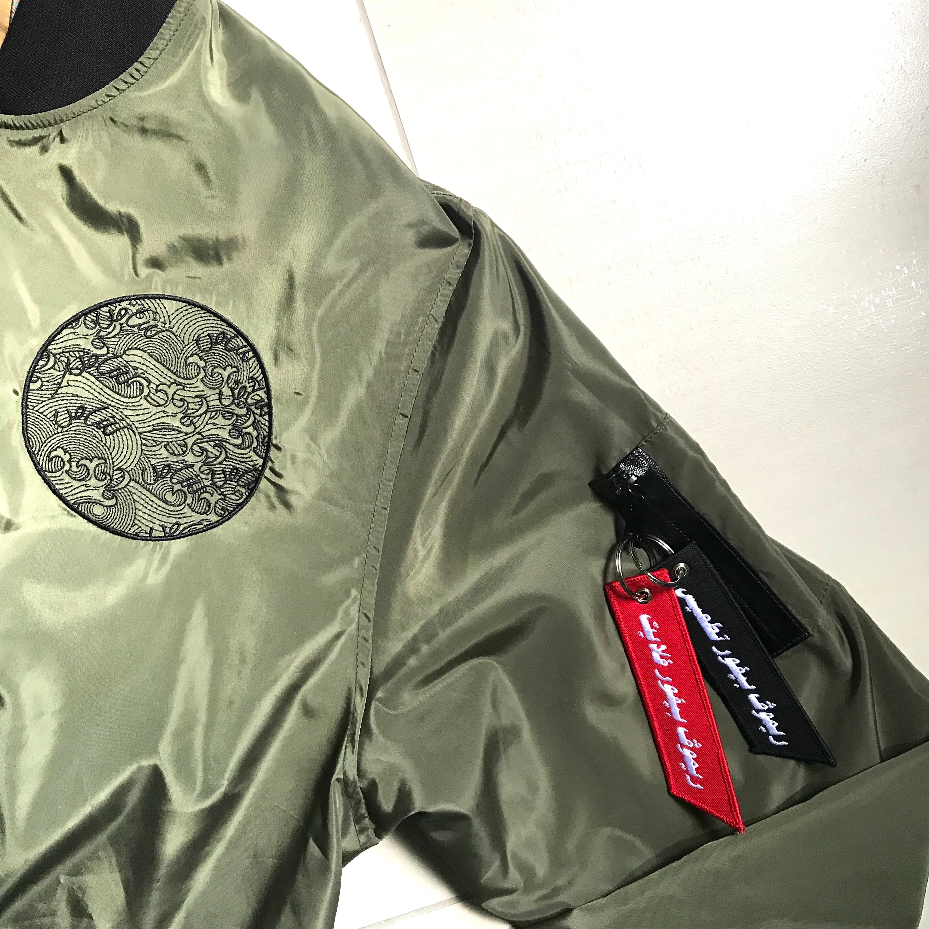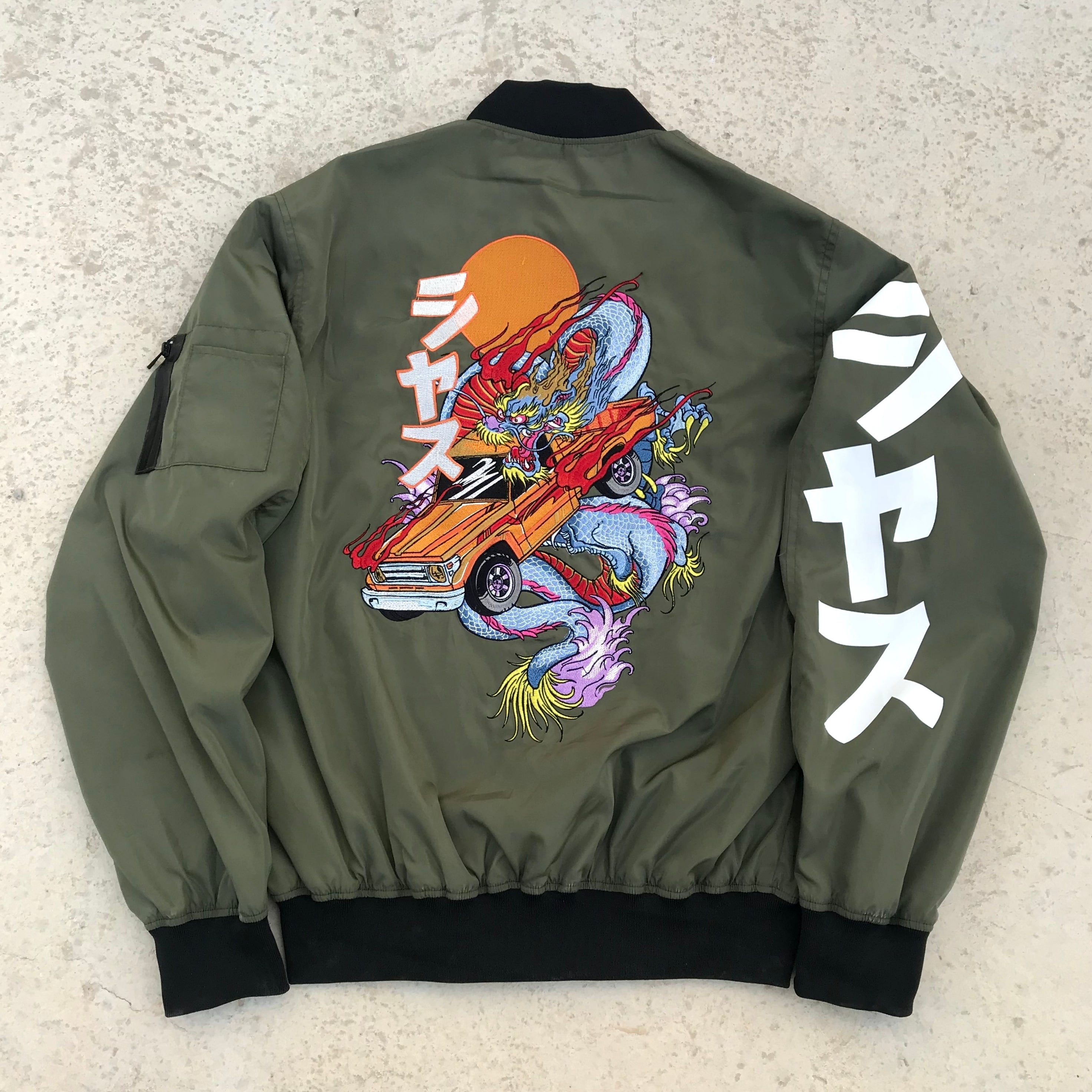 Super unique embroidered illustration that blends a Middle Eastern cultural icon, the “Shas” pickup truck, with the a Japanese dragon. Embroidered on a super comfortable street style bomber jacket.